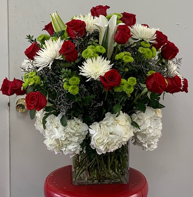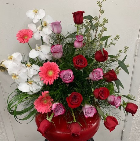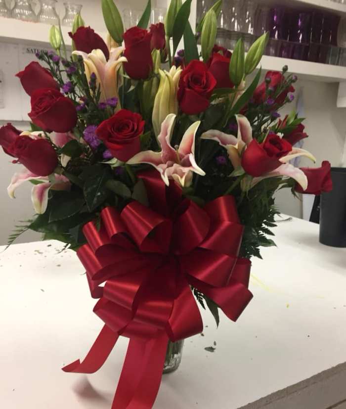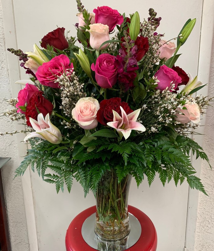 We offer a variety of floral arrangements featuring a dozen roses. Our prices start at $85, excluding tax and delivery fee.