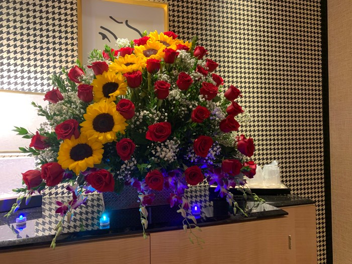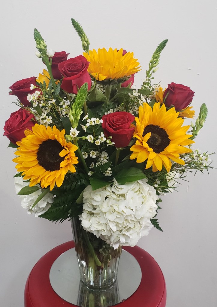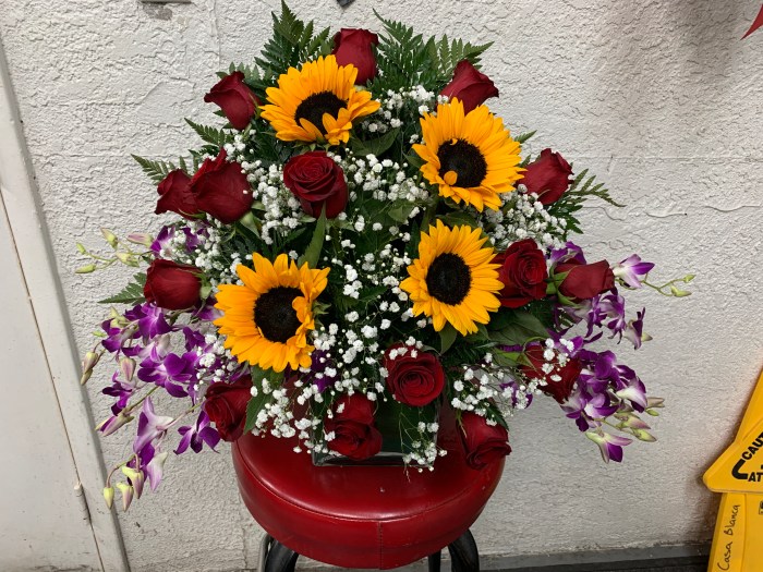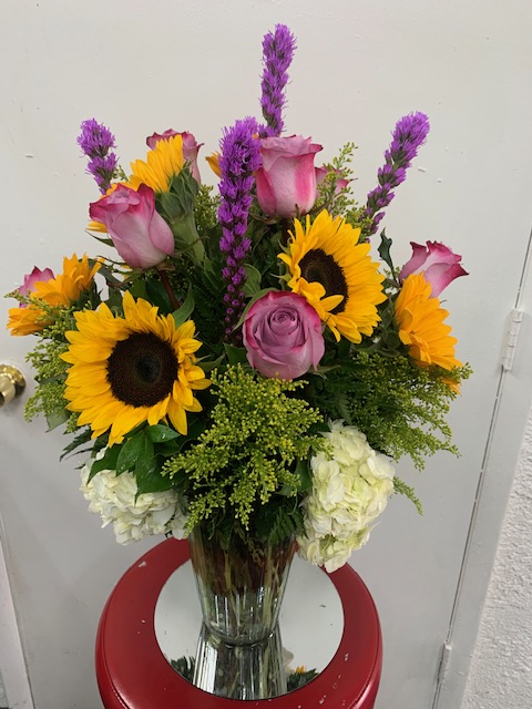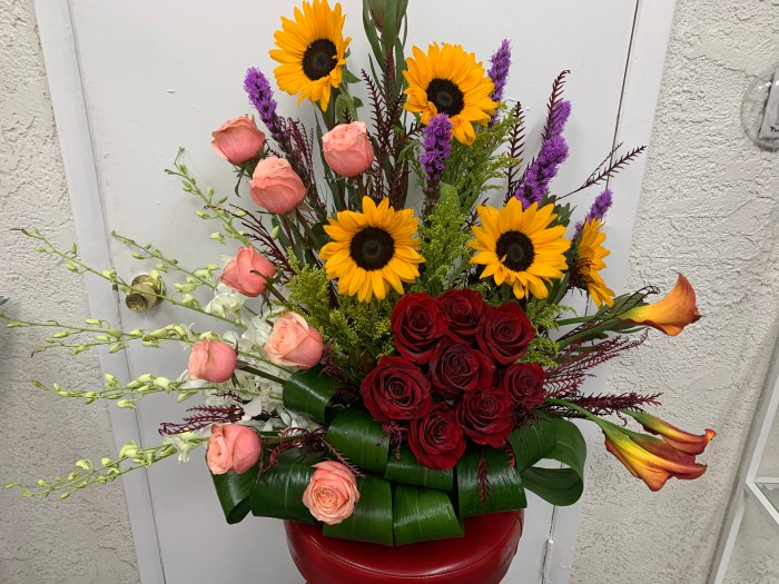 We offer a variety of floral arrangements featuring SUNFLOWERS OR CALLA LILIES. Our prices begin at $100 excluDING tax and delivery FEE.
